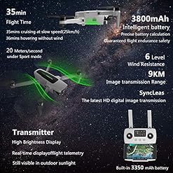 Übertragungsentfernung: 9 km; Maximale Flugzeit (windstill): 35 min. Eingebaute 3800-mAh-Smart-Lithium-Batterie, genaue Überwachung der Batterieleistung zur Gewährleistung der Flugsicherheit.